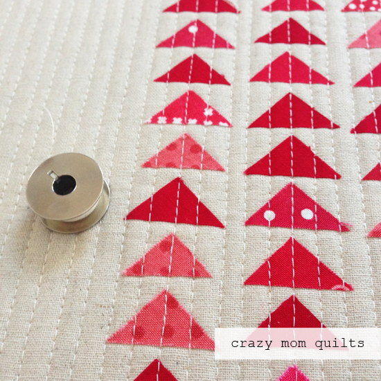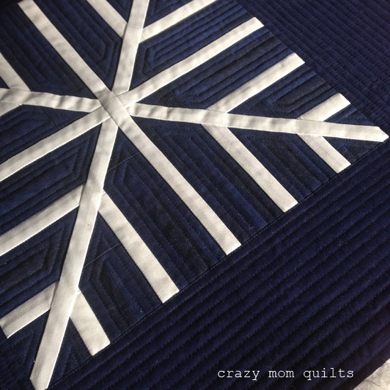 I had a lot of fun playing with different arrangements, but settled on this simple configuration. I was afraid that the quilting would distort it, but there were no problems whatsoever. Hurray!