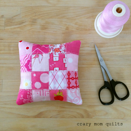 My daughter got pink eye this week....so I've had pink on the brain. (What can I say, inspiration comes from the strangest places!) I thought about making a pink pillow, but that would take too long, so a pink patchwork pincushion was the next obvious choice. Ha!