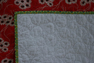 here's a close up of the quilting. i really like quilting in circles. it's fun! i used a katie jump rope fabric for the backing and a bright green flea market fancy print for the binding. I LOVE this print on the binding.