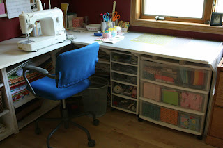 My husband and I share a studio/office/craft room...whatever you want to call it. It's not a large room-about 9' x 11'-but we make it work. I'll only share about my side of the room. :) My desk was custom built by my husband two houses ago. Every time we move, we talk about scraping it, but we end up moving it every time. It measures 6' on each side. I love it...it gives me plenty of work space with plenty of storage beneath. He built it around some baskets that I already had from IKEA and roller carts that we had from Target. It's made from MDF (medium density fiber board). I painted it white.