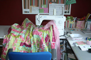 Today I used one of my curtains for a quilt backing. I think I just might be taking this "use what you have" thing a little too far. :) The curtain actually started out life as an IKEA flat sheet. I hope it works well in a quilt because a flat sheet for $2 is a GREAT deal for a lot of fabric! I guess you can see where my priorities are.