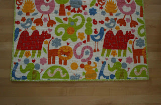 I so love this! At first look I thought it was pieced separately and then sandwiched and quilted, and I thought, "Oh my, she's really got some patience and some amazing rotary cutting skills!" (neither of which I possess). LOVE LOVE LOVE how colorful it is, and the backing is so fun.