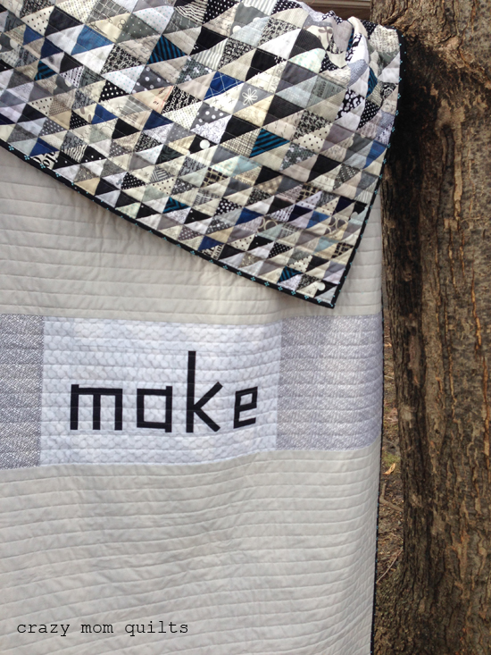 Remember the word "make" that I pieced from Cheryl's new fabric line? It found it's way onto the back of this quilt! Since it coordinated so well with the front, I had to incorporate it into the backing.