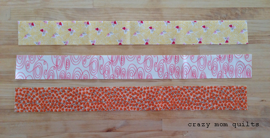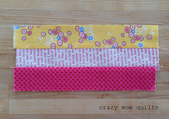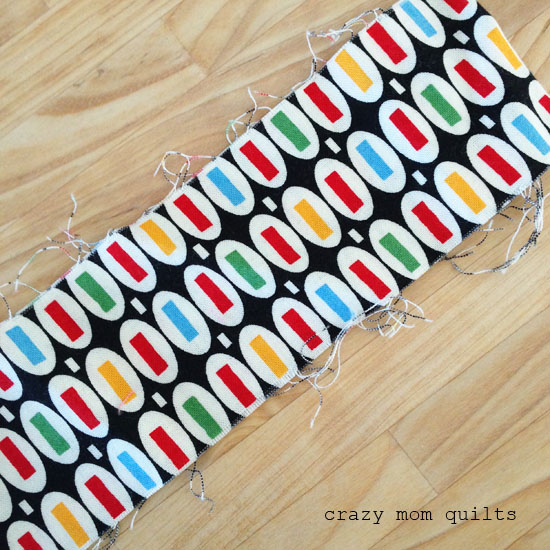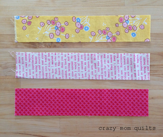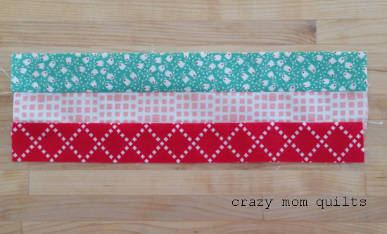 Sew the strips together and press seams to the side, or open, whichever you prefer. I generally press the seams toward the darker fabrics.