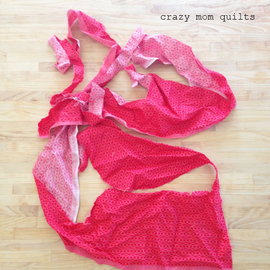 3. Clean them up. If you have fabric that was previously sewn together (like strips leftover from a quilt backing), cut them apart and remove the sewn seams. If you have odd cuts, whether you've cut out one circle or a complete garment, cut the remainders into usable pieces, like squares, rectangles, strips or triangles.