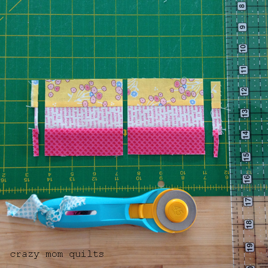 Trim the strip set to make 3 blocks, each measuring 3 1/2" square.