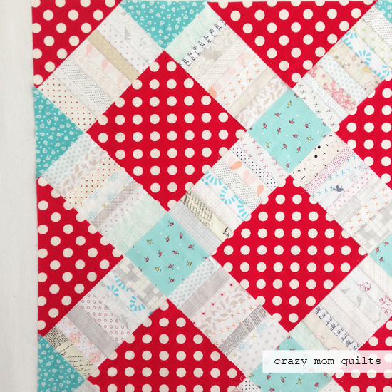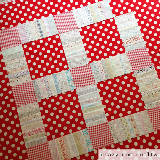 After I made several low volume strip set blocks, I arranged them on my polka dot background fabric to see how it would look. It looked awfully bold and a little "out there". I wasn't completely sold on it.