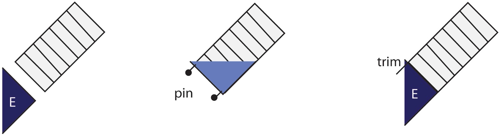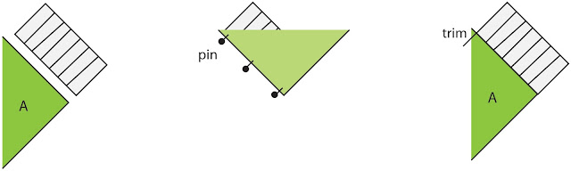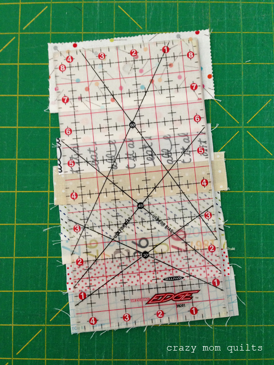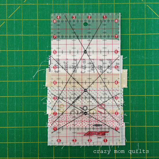 As you are making the strip sets, you may come across a time when one of your strips is no longer straight, but curved, as shown above. If this happens, take a second and trim it straight. (Or straighter, it doesn't have to be perfect.)