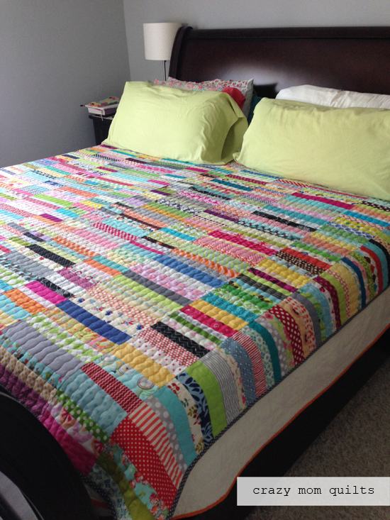 This is a twin sized string quilt, but I've been using it as a second layer on my bed. I love the way it looks in my room, so I'm going to make a larger version of it. I'm super excited about my new plan. After all, you can't go wrong with scrappy! :) And....