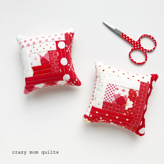 My neighbor ordered a pincushion to give as a gift, so I made one for her as well. I had a blast making these from my teeny tiny scraps.