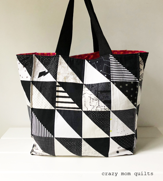 Here is a half-square triangle version that my friend brianne made for me last summer. I love the black and white paired with the hot pink and orange lining. It's a great combination of her taste and mine. I have used this tote quite a bit and it's holding up quite nicely. It's such a fabulous size for many different uses.